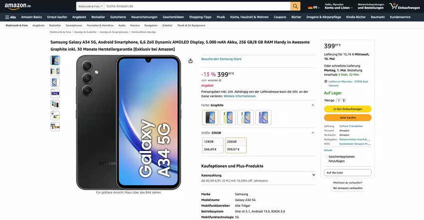 We hebben het over het Galaxy A34 5G-model. De smartphone wordt op Amazon verkocht in vier kleuren en twee geheugenmodificaties: