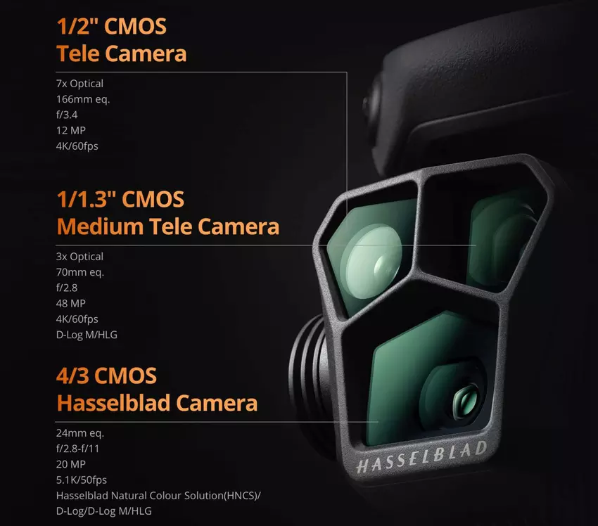De derde camera van DJI Mavic 3 Pro is een andere telelens. Ook deze schiet video in 4K UHD bij 60 FPS, maar de zoom is verhoogd naar 7x. De resolutie is 12MP (1/2" CMOS) en het diafragma is f/3.4. De telelens ondersteunt Apple ProRes (10 bit) en H.264/H.265 (8 bit). Uiteraard heeft de camera optische beeldstabilisatie gekregen.
