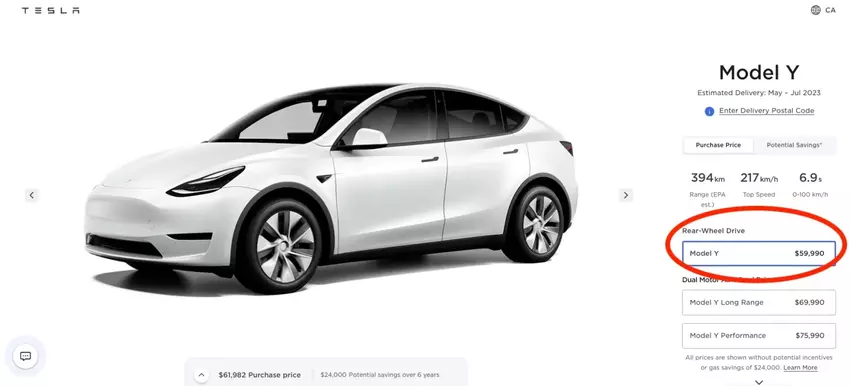 Vorige week heeft Tesla zijn Canadese website bijgewerkt en een aankondiging toegevoegd dat er binnenkort een nieuwe versie van de Model Y op de markt komt. Deze zal CA$59.990 ($44.200) gaan kosten, wat CA$10.000 ($7370) en CA$16.000 ($11.790) goedkoper is dan respectievelijk de Long Range en Performance varianten. Kopers zullen een elektrisch voertuig kunnen krijgen van mei tot juli 2023.