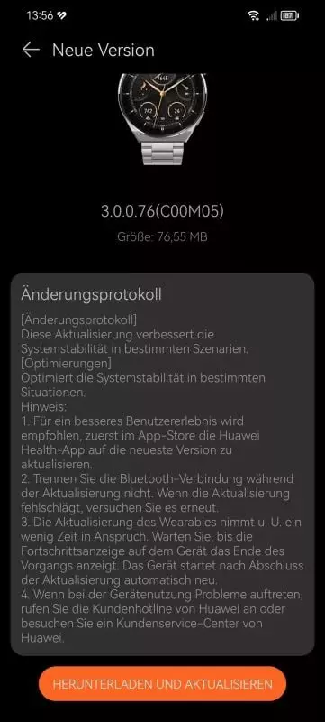 Het systeem kwam uit met buildnummer 3.0.0.76 en weegt 76MB. In tegenstelling tot de Huawei Watch GT 3 is de firmware voor de Huawei Watch GT 3 Pro wereldwijd uitgebracht. Het is al begonnen met het ontvangen van gebruikers. Je kunt controleren op OTA's in de app op je smartphone.