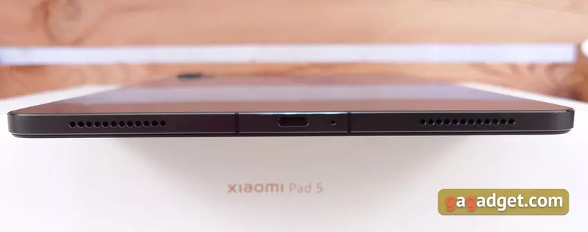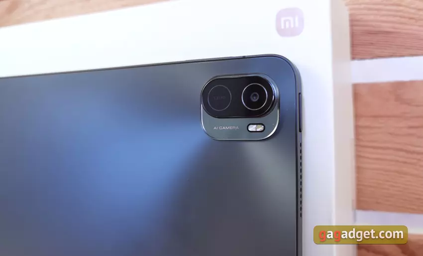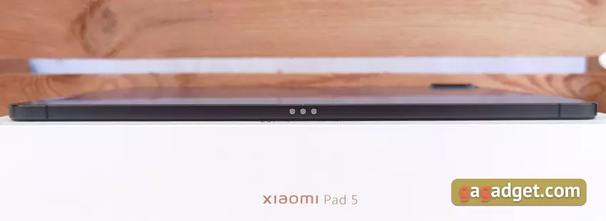 De voorkant van alle moderne tablets Xiaomi Pad 5 verschilt praktisch niet van elkaar. Een groot scherm en een zwart kader rond de omtrek. Het is niet te dun: het is toch geen smartphone, en het is niet helemaal goed om het te dun te maken. Het frame is aan alle kanten even breed en de hoeken van het scherm zijn afgerond en volgen de hoeken van de tablet. Het frame verbergt de lichtsensor en de frontcamera. De frontcamera bevindt zich in het midden van de linkerrand, wanneer de tablet horizontaal wordt gedraaid. Vanaf nu is dit de positie waarin de tablet zich bevindt.