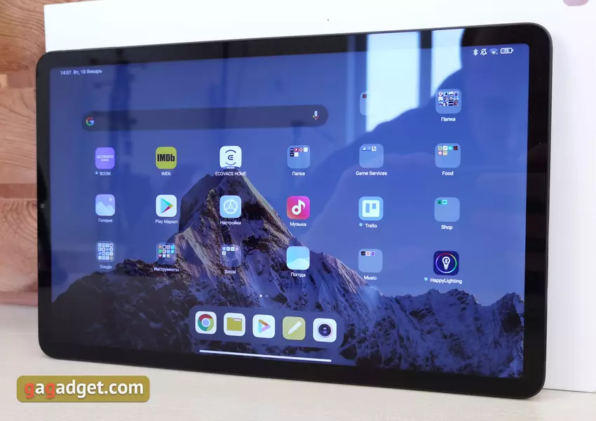 De tablet is vrij groot: 254,7x166,25 mm, wat niet verwonderlijk is met een schermdiagonaal van 11 inch. Tegelijkertijd erg dun: 6,85 mm. Het gewicht is indrukwekkend: 511 g, dus het is niet erg comfortabel om de tablet met één hand vast te houden.