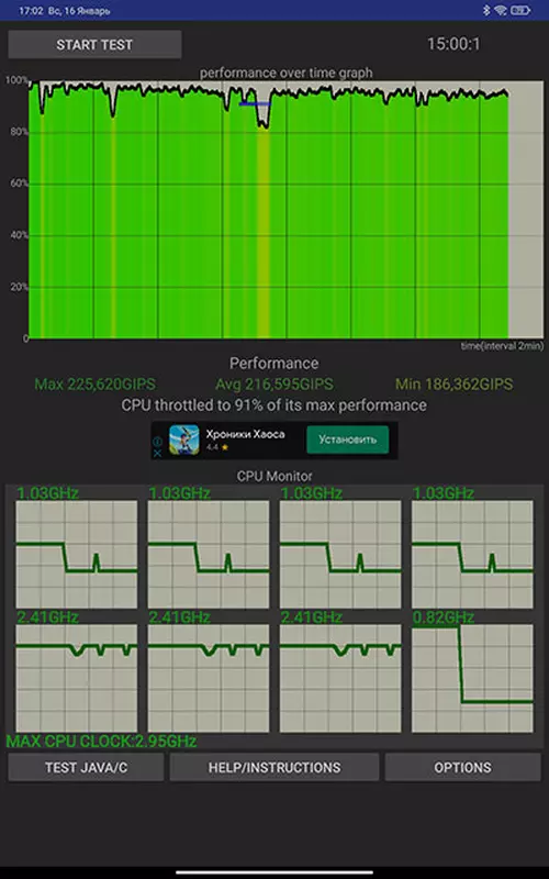 CPU Throttling Test laat zien dat de tablet vrij stabiel werkt, zelfs onder lange maximale belasting, de prestaties dalen tot 91%, wat vrij normaal is. Tegelijkertijd wordt de tablet zelf slechts licht warm.