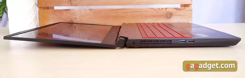 Het scharnier van de MSI Katana GF66 11UD maakt het mogelijk om de notebook met één hand te openen. De maximale hoek is bijna 180°. Het beeldscherm klikt mooi in positie. Maar het beeldscherm zelf blijkt erg licht te zijn en het trilt een beetje als je het met je hand vastpakt.