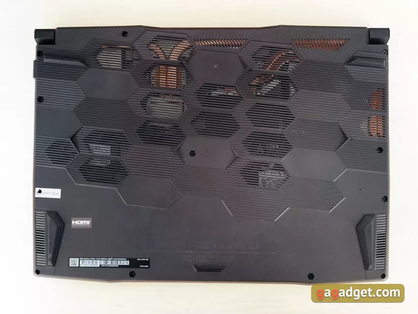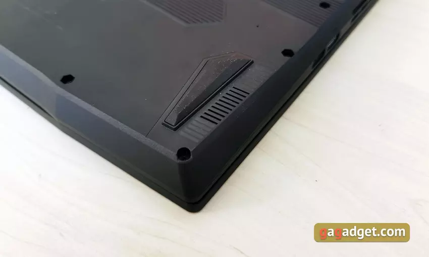Volgens de officiële website was de Japanse illustrator Tsuyoshi Nagano betrokken bij het ontwerp van de MSI Katana GF66 11UD. De laptop ziet er erg ingetogen en sober uit, in tegenstelling tot een stel gamer modellen met achtergrondverlichting uit alle hoeken. In dit geval is er alleen het toetsenbord met achtergrondverlichting. De behuizing is volledig gemaakt van praktisch matzwart plastic. Het verzamelt praktisch geen vingerafdrukken. Het enige modieuze kenmerk is het logo van MSI in reliëf op het bovendeksel.