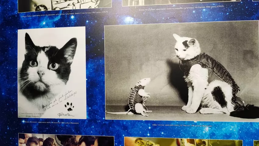Tussen de foto's van de eerste dieren die naar de ruimte werden gestuurd (de honden Laika, Belka en Strelka, en een chimpansee die door de VS werd gestuurd), was het interessant om de Franse kat Felicette te zien. Zij werd op 18 oktober 1963 naar een hoogte van 160 kilometer gestuurd. Maar de kat vertoonde grote onrust tijdens de vlucht, zodat er geen katten meer de ruimte in werden gelanceerd. De chimpansees waren overigens erg nerveus tijdens de vlucht, maar de honden waren volgens de gids rustiger.