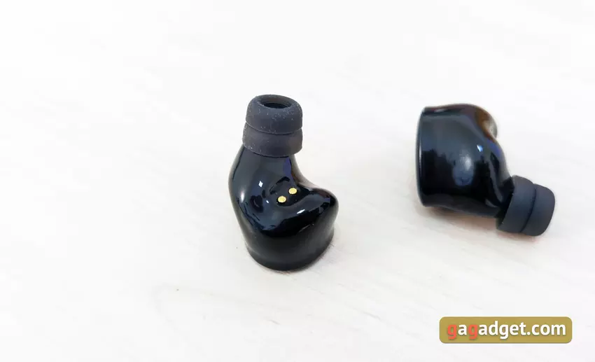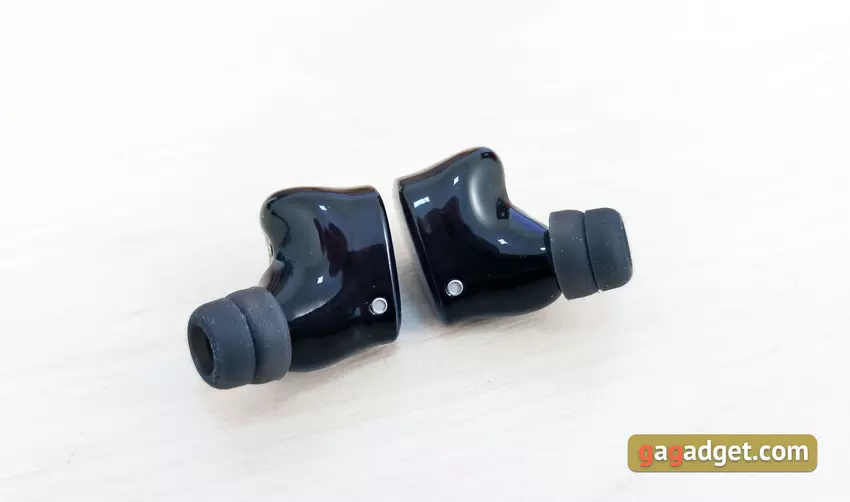 Dankzij de grote buitenpanelen is het gemakkelijk en comfortabel om je vingers op de sensoren van de hoofdtelefoon te krijgen. Het standaard bedieningsschema is best handig, maar het kan worden gewijzigd in de eigen app. De standaard enkele tik op beide oortjes is afspelen/pauzeren, het gesprek beantwoorden. Dubbele en driedubbele tap op het rechteroorstuk - track switching, dubbele en driedubbele tap op het linkeroorstuk - volumeregeling, lange tap - lancering van de spraakassistent.