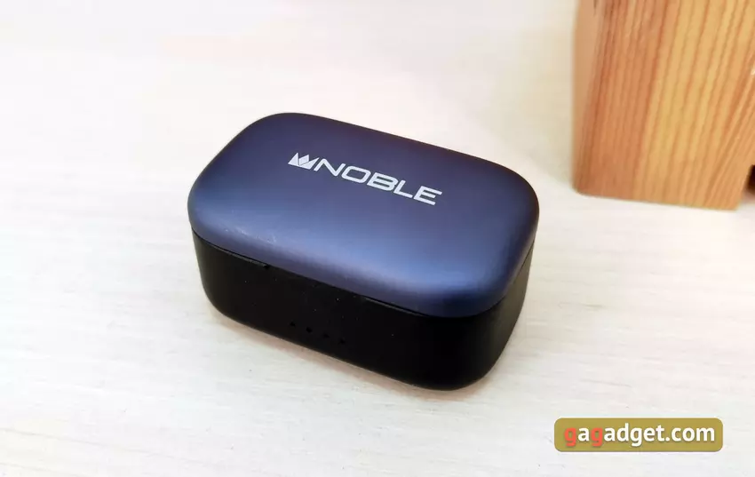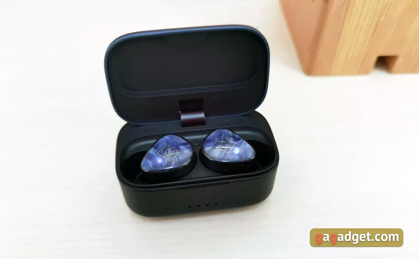 Het deksel is magnetisch automatisch intrekbaar in gesloten toestand en gaat niet uit zichzelf open. In de behuizing zitten twee koptelefoonsleuven met oplaadcontacten, markeringen links en rechts en een resetknop. De hoofdtelefoon wordt stevig op zijn plaats gehouden door magneten en valt er niet uit, zelfs niet als je met opzet schudt. Maar het is niet gemakkelijk om ze eruit te krijgen, het duurt even om eraan te wennen.