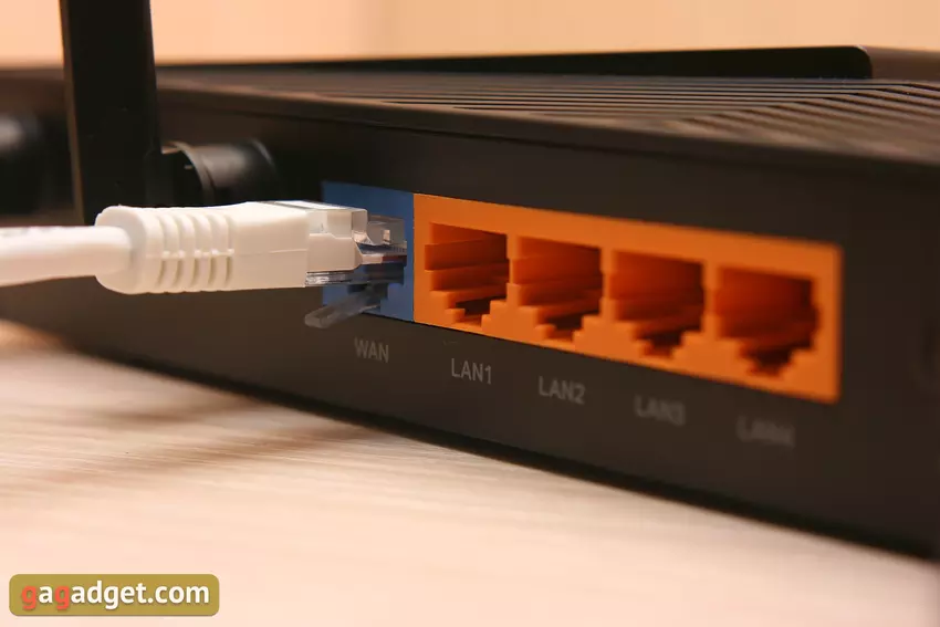 Alle Ethernet-poorten, zowel LAN als WAN, - gigabit, we hadden niets minder verwacht van het apparaat van deze klasse. Er is hier echter geen mogelijkheid om twee poorten te combineren voor snelheidssamenstelling of om een van de LAN-poorten te gebruiken als reserve WAN.