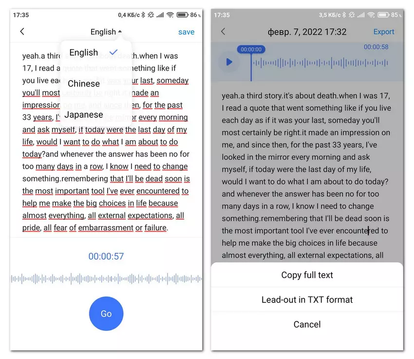 Ten tweede is er de opnamefunctie (Voice notes), een opnametool om stem in real time te transcriberen en vervolgens op te slaan. Zowel audio als tekst worden opgeslagen in de app. Merk op dat deze functie momenteel alleen is geïmplementeerd voor Engels, Chinees en Japans. Het is niet duidelijk of de lijst met talen zal worden uitgebreid, maar het zou erg mooi zijn. U kunt de kwaliteit van de herkenning beoordelen aan de hand van het screenshot. De bron van de test is een fragment van de beroemde toespraak van Steve Jobs aan de Stanford University. De audio kan worden opgenomen via zowel de microfoon van de hoofdtelefoon als die van de smartphone. Het is niet duidelijk waarom de juiste tekst meteen wordt onderstreept met een rode kronkellijn, zoals bij fouten. We wachten op Russisch en Oekraïens in toekomstige versies van de applicatie, want het is handig om onderweg wat ideeën op te schrijven, en die dan als tekst te gebruiken.