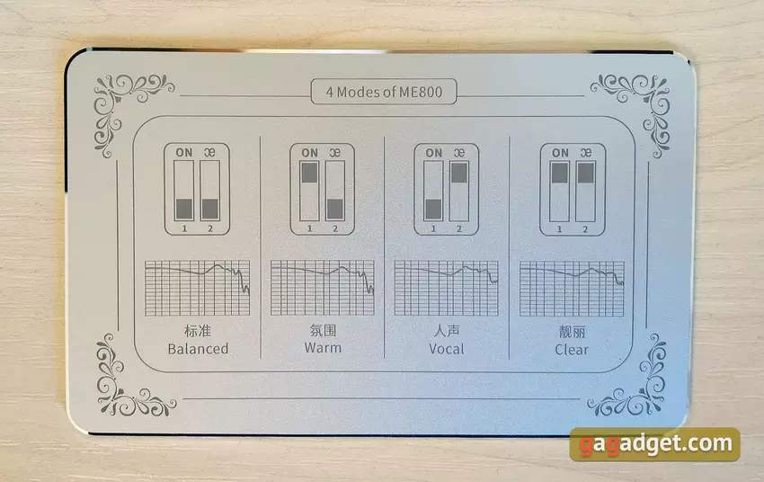 Als vlaggenschipmodel wordt de Shanling ME800 geleverd in een zeer indrukwekkende verpakking. De hoofdtelefoon wordt geleverd in een kartonnen doos die aanzienlijk groter is dan alle moderne smartphones. Binnenin op het eerste "niveau" van de verpakking bevinden zich de hoofdtelefoon zelf, een verwijderbare Furukawa kabel (waarover we hieronder meer in detail zullen spreken) en een metalen plaatje met schematische instructies voor het aanpassen van het geluid met de schakelaars op de hoofdtelefoon. In het onderste compartiment vind je nog 11 paar hoofdtelefoons (waaronder Comply-schuimen), verwisselbare 2,5 mm, 3,5 mm, 4,4 mm kabelaansluitingen, een 6,3 mm jack-adapter, een schoonmaakhulpmiddel en een lederen etui.