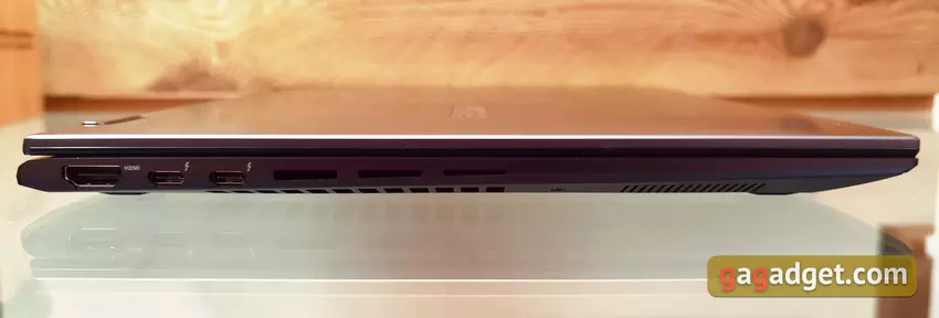 De ASUS Zenbook 14 Flip OLED is een ultradraagbaar model, dus de poortenset is vrij bescheiden, hoewel alle essentials aanwezig zijn. De rechterkant heeft 1 USB 3.2 Gen 2 Type-A poort, een 3,5mm combo audio jack, een microSD kaartlezer, LED indicatoren en ventilatieopeningen.