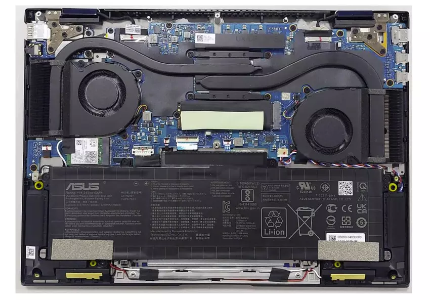 De ASUS Zenbook 14 Flip OLED maakt gebruik van het IceCool Plus koelsysteem met twee 8mm en 6mm heat pipes en twee nieuwe IceBlades ventilatoren met 87 en 83 bladen. Ze zijn gemaakt van vloeibaar kristal polymeer, lichter en dunner dan conventionele ventilatoren. Ze hebben een gebogen vorm die aerodynamisch is ontworpen om een hogere luchtstroomdruk te bieden. Bovendien maken de IceBlades-ventilatoren gebruik van hydrodynamische lagers, die trillingen en lawaai helpen verminderen in vergelijking met andere soorten lagers.