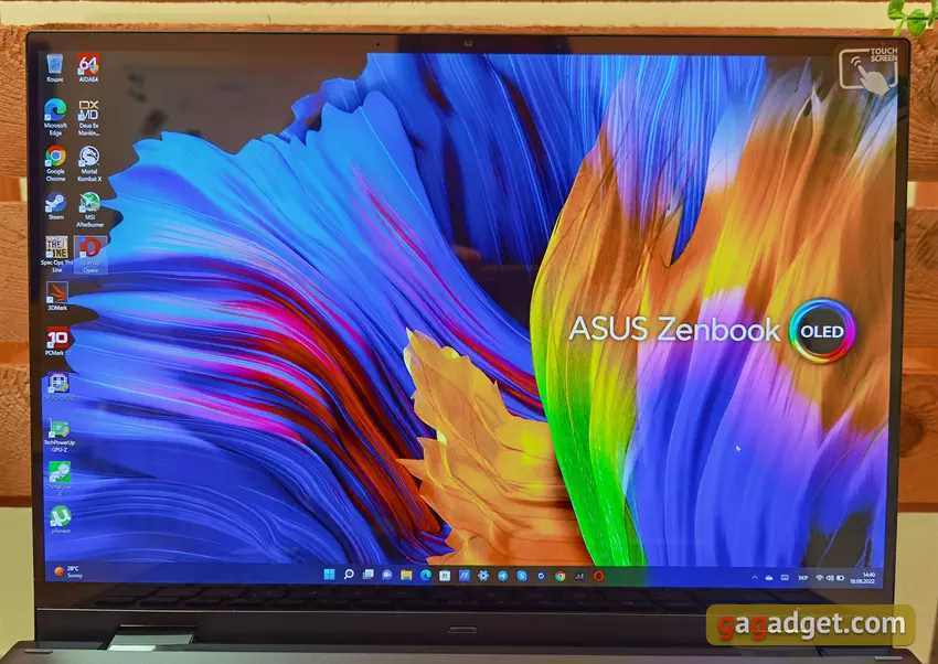 Een van de meest interessante kenmerken van de ASUS Zenbook 14 Flip OLED is het scherm. In ons geval is het een 14-inch OLED met 2880x1800 (2,8K) resolutie, een 16:10 beeldverhouding, een 0,2ms responstijd en een verversingssnelheid van 90Hz. Er zijn 4K-opties, hoewel er geen kritische behoefte is aan een dergelijk diagonaal. Hij belooft 'echt' zwart, HDR-ondersteuning, 100% DCI-P3-kleurruimtedekking, 1.000.000:1 contrastverhouding, 1,07 miljard kleurreproductie en PANTONE-certificering. Het scherm maakt indruk met zijn sterk verzadigde beeld, hoge helderheid en maximale kijkhoeken. Apart vermeldt ASUS dat het tot 70% van het schadelijke blauwe licht wegfiltert. Het scherm is aanraakgevoelig en de ASUS Pen 2.0 stylus kan 4096 druk- en kantelniveaus detecteren.