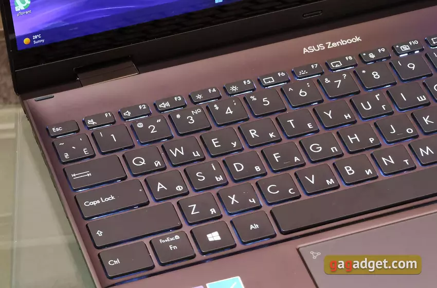 Het toetsenbord beslaat bijna de hele breedte van de notebook. Het is niet helemaal standaard: naast de gebruikelijke ultrabook unit zijn er aparte Home, PgUp, PgDown en End knoppen aan de rechterkant. Eerder werd deze oplossing gebruikt in de grotere 15" Zenbook. Al het andere gebeurt zoals gebruikelijk: iets lager zit de bovenste rij functietoetsen (inclusief de microfoon en webcam mute toetsen). Het eindigt met de powerknop, die een ingebouwde vingerafdrukscanner heeft en lager gepositioneerd is dan de andere toetsen om te voorkomen dat ze per ongeluk worden ingedrukt. Zowel Shift is lang, Enter is enkelvoudig. Het pijlblok is minder hoog.