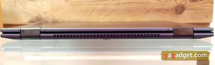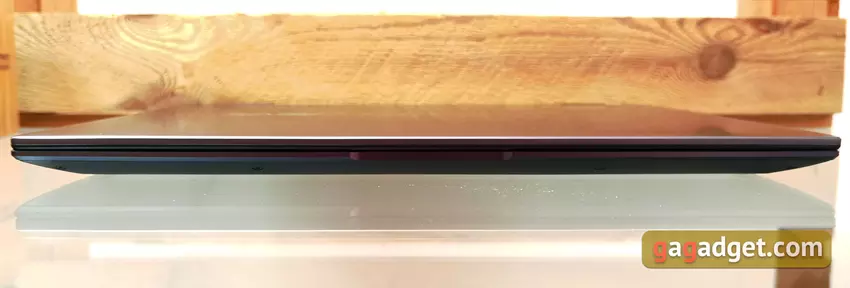 Aan de voorkant is een uitsparing voor het makkelijker openen van de laptop. Dus al met al, structureel, is alles vrij vertrouwd, op zijn plaats.