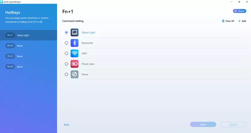 Met de ASUS ExpertWidget-applicatie kunt u acties of functies instellen op de Fn+1, 2, 3, 4 combinaties. Deze kunnen zo eenvoudig zijn als het in- en uitschakelen van draadloze interfaces of het wijzigen van de prestatiemodus, maar ook het starten van programma's.