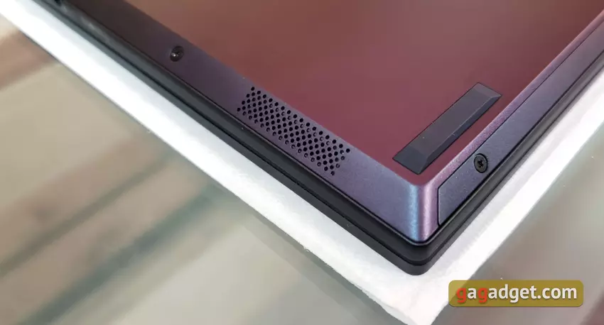 De onderkant van de laptop heeft veel gaten voor ventilatie. Aan de achterkant is er een rubberen inzetstuk bijna over de hele breedte van de notebook, aan de voorkant zijn er nog twee rubberen voetjes voor een stevige positie op tafel. Dichter bij de voorkant van de notebook zitten stereoluidsprekers aan de zijkanten. De bodemdeksel is bevestigd met tien standaard kruiskopschroeven, dus het zou niet al te moeilijk moeten zijn om te verwijderen. Dit geeft je de mogelijkheid om een tweede M.2 SSD te vervangen of toe te voegen. Deze kunnen werken in RAID0/1 modi. Er is ook één vrij RAM-slot. Niet slecht genoeg voor zo'n compact model.