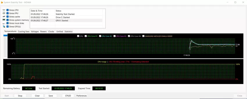 Het koelsysteem van de ASUS ExpertBook B5 is zonder speciale ontwerpkenmerken. Het omvat een koellichaam, heat pipe en een enkele ventilator. Maar het bleek verrassend efficiënt te zijn, al is de energiezuinige processor daar ook een verdienste van. In de AIDA64 stress test, tijdens maximale belasting, warmen de componenten op tot ongeveer 90° vanaf het begin, en de processor daalt de prestaties. Na ongeveer een minuut past het koelsysteem zich aan de belasting aan, draait het systeem op maximale efficiëntie en blijft de temperatuur van de componenten rond de 60°. Bij kantoortoepassingen is het koelsysteem niet hoorbaar. Het geluidsniveau onder belasting is minimaal. De behuizing boven het toetsenbord wordt slechts een beetje warm.