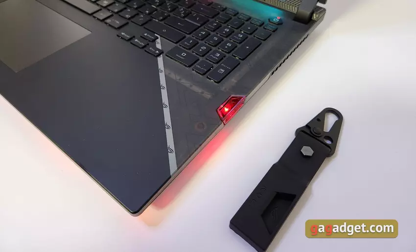 Het werkoppervlak is ook verdeeld in twee delen, waarvan de bovenkant is versierd met op ROG geïnspireerde WORM artwork. Aan de rechterkant zit een Keystone NFC-toets om snel bepaalde instellingen te starten, of toegang te krijgen tot een gecodeerd gebied op de schijf. Keystone verscheen een paar jaar geleden voor het eerst in ASUS-laptops.