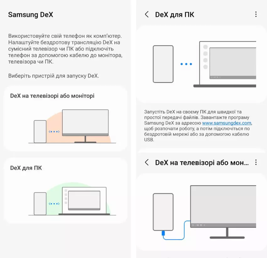 Zo zien de Samsung Dex-instellingen eruit op de Galaxy S22 Ultra-smartphone. Je kunt zowel een kabel als een draadloze verbinding gebruiken.