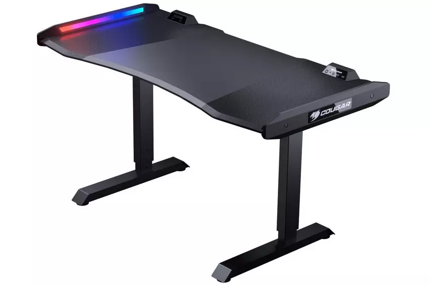 Het bureau heeft een draagvermogen tot 150 kg. U kunt er een zware computer, een ultrabreed scherm, een notebook en een gamerset met randapparatuur op plaatsen en toch voldoende bewegingsruimte overhouden. Een toplaag van koolstofvezel (carbon fibre) maakt hem zowel visueel aantrekkelijk als slijtvast. Voor een snelle aansluiting van gaming randapparatuur, een paar USB Type-A poorten, audio-aansluitingen en een RGB licht dat kan worden gesynchroniseerd met een PC en andere gaming gadgets op de tafel.
