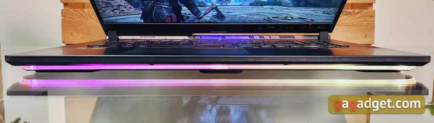 Er zijn geen functionele elementen op de voorkant van de laptop, alleen een decoratieve RGB gestreepte achtergrondverlichting. Natuurlijk kan deze worden uitgeschakeld zoals elke andere achtergrondverlichting op een notebook.