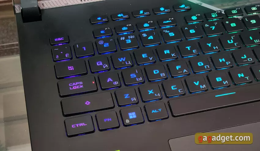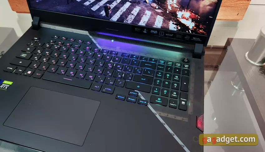 De scharnieren vergrendelen het beeldscherm vrij goed in positie. Het scherm wiebelt niet als je er per ongeluk met je hand tegenaan stoot. Van de kleine dingen met betrekking tot de cover kan alleen een klein lipje worden toegevoegd, dat helpt om het op te pakken met je vinger bij het afscheuren. Het toetsenbord in de ASUS ROG Strix SCAR 17 SE (2022) is van volledig formaat, met een apart numeriek toetsenbord. Het is niet gescheiden van de hoofdeenheid. In alle andere opzichten komt de indeling dicht in de buurt van conventionele toetsenborden. Zowel Shift als Enter zijn lang. De bovenste functierij is minder hoog. Daarboven bevinden zich vijf extra toetsen. Standaard zijn ze verantwoordelijk voor volumeregeling, microfoon dempen, modusschakeling en het starten van de Armoury Crate app. Hierop kunnen ook macro's worden ingesteld. Het pijltjespad is ook minder hoog, maar staat iets los van het hoofdpad, zodat het comfortabel te gebruiken is. De powerknop is ook iets los en bevindt zich in de rechterbovenhoek. Al met al duurt het niet lang om aan het toetsenbord te wennen, de indeling is comfortabel.