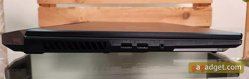 Aan de linkerkant zitten twee full-sized USB 3.2 Gen 1, een 3,5mm audio combo jack, en ventilatiegaten.