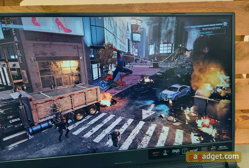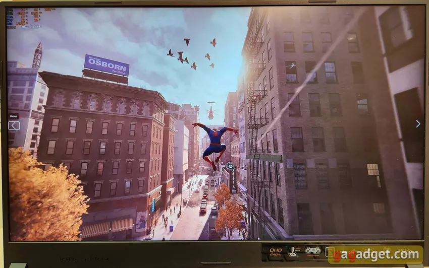 De notebook laat zeer goede prestaties zien in games. De native WQHD resolutie werd gebruikt. In Cyberpunk 2077 op ultra-instellingen met ray tracing en automatische DLSS draait op ongeveer 60 FPS, soms dalend tot 55. Dying Light 2, ray tracing (hoge instellingen), DLSS (gebalanceerde modus): 70-90 FPS. Gears 5, ultra-instellingen: 90 tot 160 FPS. God of War, maximale instellingen, DLSS in kwaliteitsmodus: 80-90 FPS. Shadow of the Tomb Raider, maximale instellingen, DLSS ray tracing in kwaliteitsmodus: 90-130 FPS. Spider-Man, hoge instellingen, ray tracing, DLSS in kwaliteitsmodus: ongeveer 80-100 FPS. The Ascent, ultra-instellingen, ray tracing, DLSS in kwaliteitsmodus: 60-70 FPS.