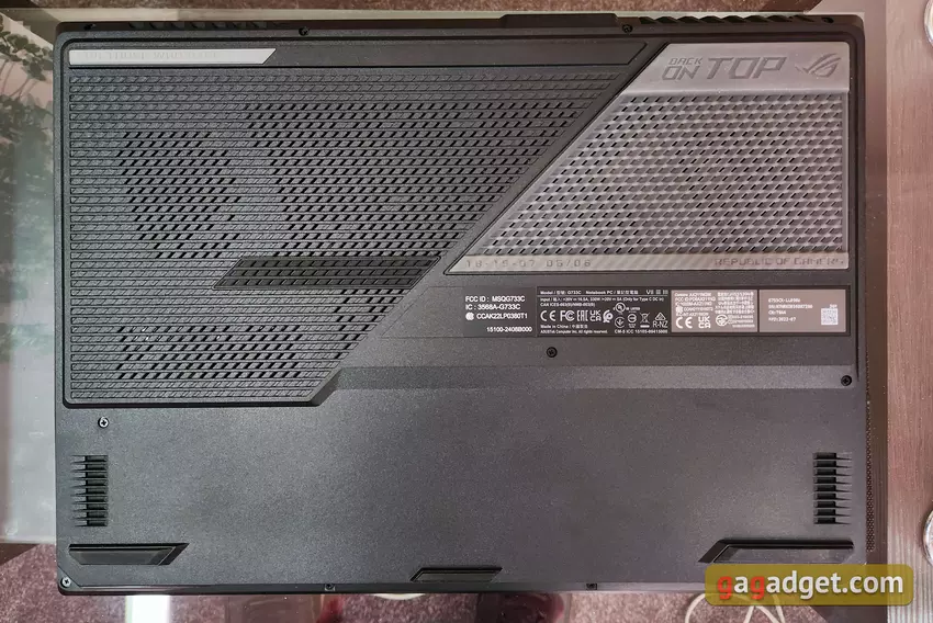 De bovenklep is interessanter. Het is het enige metalen element van de laptop. Het is ook diagonaal in twee delen verdeeld. Aan de bovenkant is een groot backlit Republic of Gamers logo. Aan de onderkant is een speciaal geïnkt ontwerp. Het is alleen zichtbaar onder ultraviolet licht, daarom bevat de verpakking een UV zaklamp.