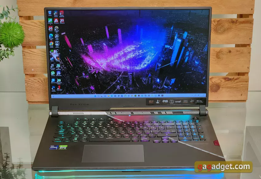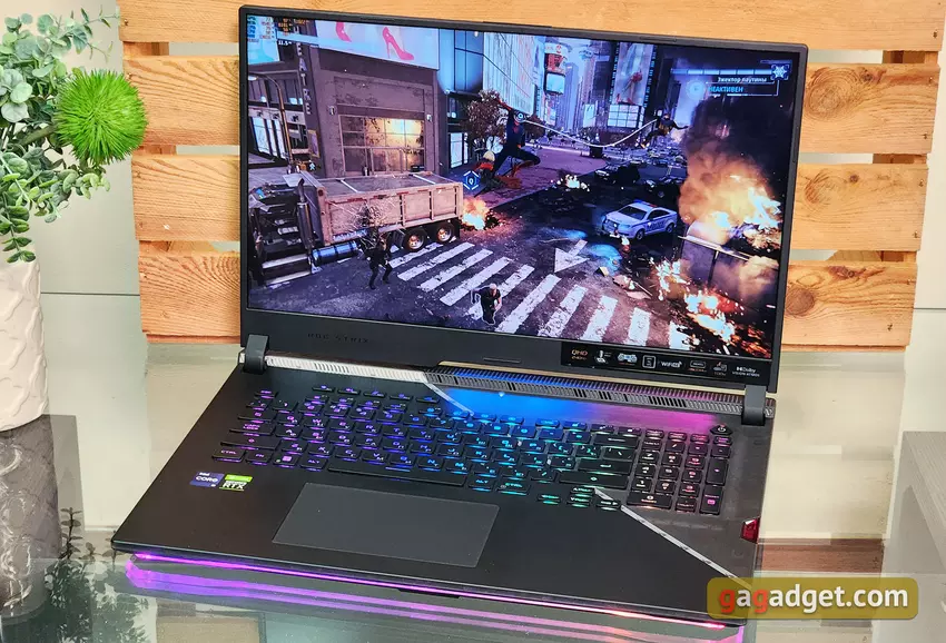 Natuurlijk is het meest interessante aspect van de ASUS ROG Strix SCAR 17 SE (2022) zijn prestaties. En je zou kunnen zeggen dat het een van de krachtigste laptops is die er momenteel zijn. Binnenin zit een 16-core Intel Core i9 12950HX 12e generatie Alder Lake processor, en hij is gemaakt met behulp van Intel 7-processortechnologie. Net als andere huidige Intel-processoren gebruikt hij 2 soorten kernen: 8 krachtige en 8 energiezuinige. Hij ondersteunt tot 24 rekenhreads. Hij bereikt een basiskloksnelheid van 2,3GHz, en Turbo Boost-snelheden tot 5GHz. Hij beschikt over een extra 30 MB Layer 3 cache en tot 1,55 GHz Intel UHD Graphics (32EU). De TDP van de processor is tot 55W in standaard modus. Maar in ons geval kan het worden verhoogd tot 65W in handmatige modus. RAM - 32GB DDR5-4800 (2x16GB), draaiend in dual channel modus. De laptop ondersteunt tot 64GB. Draadloze interfaces zijn Bluetooth 5.2 en snelle Wi-Fi 6E (802.11ax) (Dual band) 2x2. Er is ook een LAN-poort die snelheden tot 2500 Mbps ondersteunt. De gebruikte discrete video versneller is NVIDIA GeForce RTX 3080 Ti Laptop. De basisfrequentie is 1230MHz, opgevoerd tot 1590MHz met standaard TGP tot 150W. Maar ROG Boost wordt ondersteund met een verhoging van TGP tot 175W en frequentie tot 1640MHz. Het videogeheugen is 16GB GDDR6. De notebook is uitgerust met de MUX Switch multiplexer. In de regel wordt een discrete grafische kaart in alle notebooks niet rechtstreeks op het beeldscherm aangesloten, maar via geïntegreerde graphics. Met de MUX Switch kan de grafische kaart rechtstreeks op het beeldscherm worden aangesloten. Dit vermindert de latentie en verbetert de prestaties (tot 10% toename). Maar tegelijkertijd neemt het stroomverbruik toe