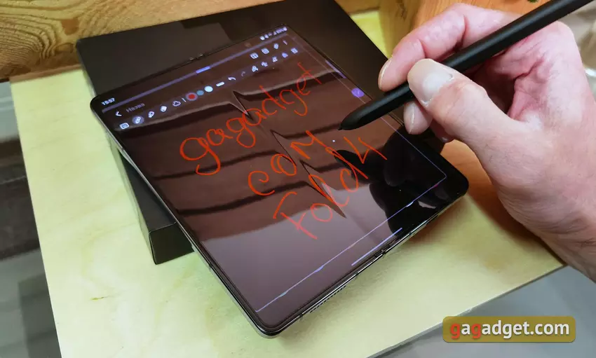 Een van de weinige verschillen tussen de Fold4 en Fold3 die met het blote oog kan worden opgemerkt (hoewel je de telefoon in je handen moet houden om het verschil te zien - het zal je moeite kosten om het van een afstand te zien), zijn de herziene afmetingen van de buitenkant. Dit heeft op zijn beurt de verhoudingen en de grootte van de schermen beïnvloed. Het nieuwe toestel is 3,1 millimeter lager geworden. Tegelijkertijd is de uitgeklapte behuizing 2 millimeter breder geworden. Samen met de kleinere schermranden heeft dit geleid tot een grotere breedte van beide schermen - de buitenste met 2,7 mm, en de binnenste met 3 mm. Dat wil zeggen dat het belangrijkste "tablet"-scherm dichter bij een vierkant kwam te liggen (maar het nog steeds niet werd). In de praktijk bleek het echt comfortabel te zijn - het is duidelijk dat de smartphone-ontwikkelaars de verhoudingen niet in een opwelling en niet omwille van de veranderingen zelf hebben veranderd, maar als gevolg van pogingen om het werkcomfort te verbeteren.