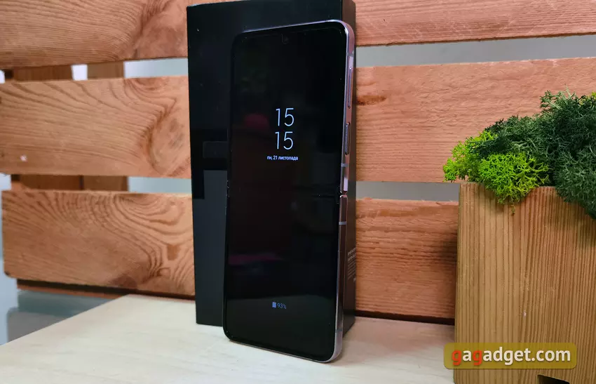 Het ontwerp van de Samsung Galaxy Flip4 blijft grotendeels ongewijzigd, met de bekende voor- en nadelen. Het is een clamshell met een klein buitenscherm en een groot flexibel binnenscherm. Opgevouwen is het een klein maar vrij dik vierkantje dat comfortabel in bijna elke zak kan worden meegenomen. Alle panelen zijn gemaakt van Gorilla Victus+ glas. Ze zijn mat in alle kleurvarianten. Er is een glanzende metalen rand, scharnier en een klein gebied met het buitenste scherm en de belangrijkste dubbele camera. Het binnenscherm heeft de bijna bekende langwerpige proporties. Het is moeilijk met zekerheid te zeggen zonder een Flip3 te hebben. Maar de rand rond de omtrek van het scherm lijkt behoorlijk te zijn gekrompen, evenals de beschermende rand. Verder is alles vertrouwd: boven het scherm zit de luidspreker, aan de bovenkant zit een rond gat voor de frontcamera. In het midden van het scherm voel je nog steeds de vouw. Helaas is het ons nog niet gelukt die weg te werken.