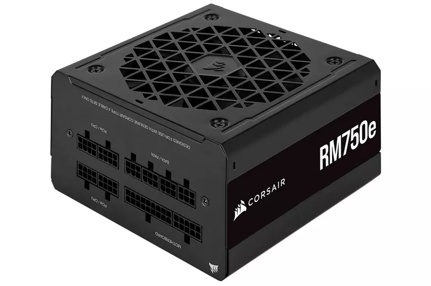 DeCorsair RM750e is een voeding met twee eervolle certificeringen tegelijk: 80 PLUS Gold energie-efficiëntie en Cybenetics A- stilte. Alleen volledig ventilatorloze PSU's hebben een betere rating, maar die kunnen niet hetzelfde hoge vermogen halen als de actief gekoelde modellen. De Corsair RM750e wordt geblazen door een ventilator met aerodynamisch gebogen bladen en een lager met schroefdraad.