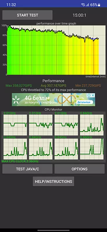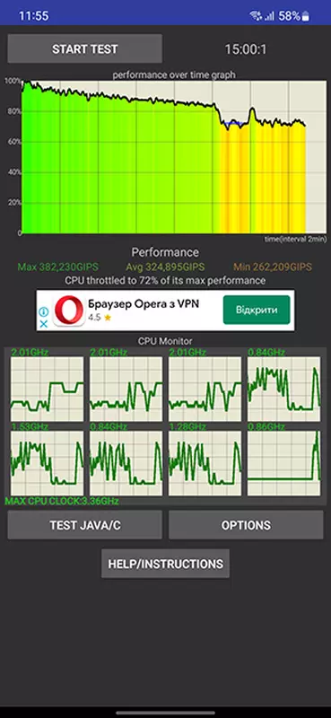 De stabiliteit van de smartphone is iets slechter dan die van de Galaxy S23 Ultra. Uit de CPU Throttling Test bleek dat onder lange maximale belasting sprake is van oververhitting en de prestaties tot 72% kunnen dalen. Tegelijkertijd wordt het metalen frame merkbaar warm. Hoewel dit in het echte leven op geen enkele manier tot uiting komt. Noch moderne games noch de camera belasten het systeem zo zwaar en bij dagelijks gebruik zijn er geen problemen met oververhitting. Dit geldt ook voor Samsung Galaxy S23+: