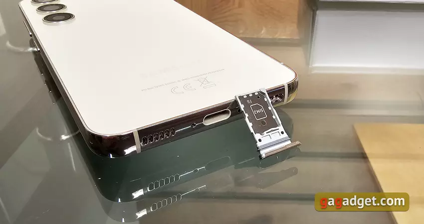 Het enige nuttige aan de bovenrand van de smartphones is een extra microfoon. Aan de onderkant zitten de hoofdspeaker, USB Type-C aansluiting, lade en twee microfoons, zoals in het Ultra-model. De vlaggenschepen van vorig jaar hadden elk één microfoon aan de onderkant. Het is moeilijk te zeggen hoeveel positief effect de extra microfoon zal hebben op stemoverdracht of geluidsopname. Hoe dan ook, er waren eerder geen problemen mee.