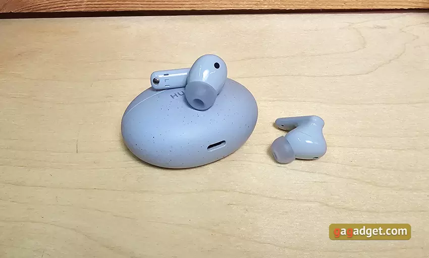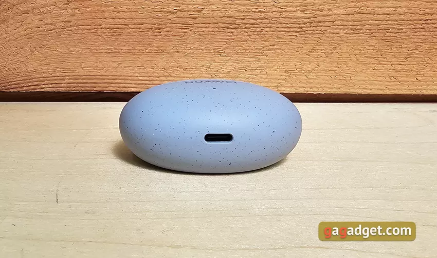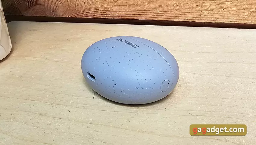 De oplaadcase is compact, ovaal van vorm. Hij weegt slechts 33 gram zonder de hoofdtelefoon. Je kunt hem vrij comfortabel in je zak dragen, hij is nauwelijks voelbaar. In de blauwe hoofdtelefoonversie heeft de case een mooie matte textuur en kleine donkere vlekjes. Daardoor blijft hij er lang netjes uitzien. Op de voorkant staat een Huawei-logo en een LED-indicator voor de oplaad- of verbindingsmodus. Aan de zijkant zit een enkele knop die verantwoordelijk is voor het activeren van de verbindingsmodus.