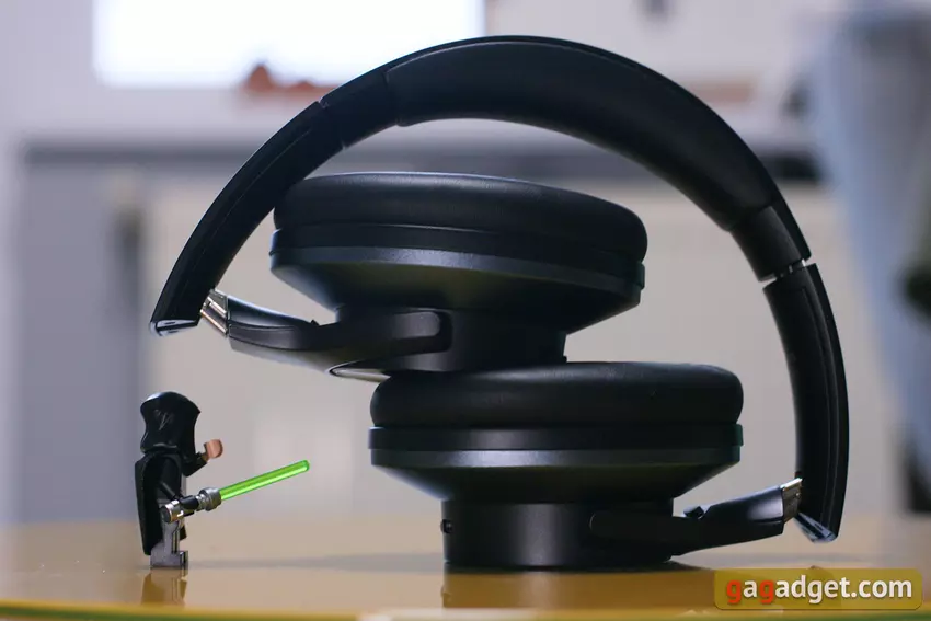 De OneOdio Focus A10 gesloten draadloze hoofdtelefoon met opvouwbare hoofdband en inzetbare oorkussens is een geweldig model waarbij de transparantiestand belangrijker (en inderdaad effectiever) is dan de ACP zelf. In de officiële winkel OneOdio op Aliexpress (onder voorbehoud van kortingen op het moment van publicatie) krijg je voor een nominale $ 50 een fatsoenlijk geluid zonder al te veel bas, een middelmatige ruisonderdrukking met uitstekende transparantie, een benijdenswaardige batterijduur, de mogelijkheid om bedraad te verbinden, werken met twee smartphones, nou ja, en gewoon een mooi, solide ding, dat kan worden opgevouwen tot een handige draagtas die gelijktijdige koppelingsmodus met twee apparaten ondersteunt (alles, zoals we willen).