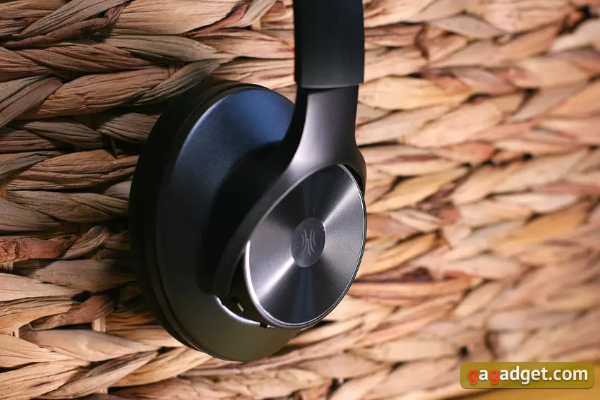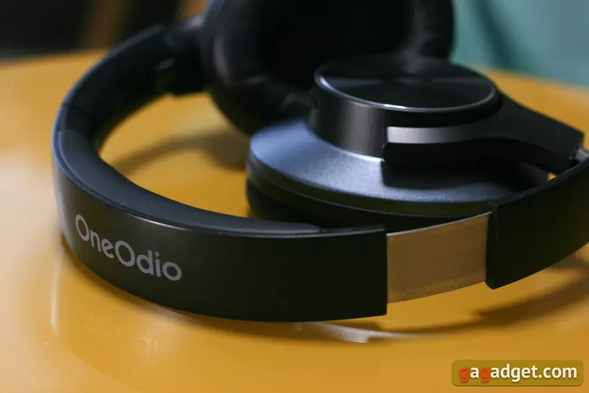 De rest van de buitenkant van de cups is bedekt met een blauwe metallic afwerking. Binnenin zijn de oorkussens voorzien van zeer zachte eco-leren kussentjes, en de luidsprekers zijn bekleed met schuim en stof, gemarkeerd met "R" en "L" voor respectievelijk de rechter en linker oordopjes. De hoofdband wordt beschermd door zwart mat plastic met het OneOdio-logo op de bovenkant. Hij is in grootte verstelbaar met een klassiek metalen mechanisme, de verandering van grootte gaat gepaard met een aangename klik. De hoofdband is gewatteerd en bekleed met hetzelfde aangename eco-leder.