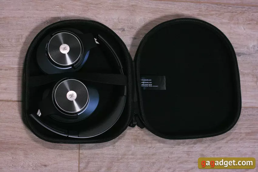 Het pakket van de OneOdio Focus A10 bevat de hoofdtelefoon, een hard zakje met rits om hem in op te bergen, een USB-C naar USB-A kabel voor het opladen, een mini-jack naar mini-jack audiokabel voor bedrade aansluiting en instructies. De doos is overigens behoorlijk respectabel, dik karton, selectieve lak - geen schande, in het algemeen. Het zakje is ook erg handig voor een huishouden, hoewel het stof zich gemakkelijk hecht aan het textieloppervlak.