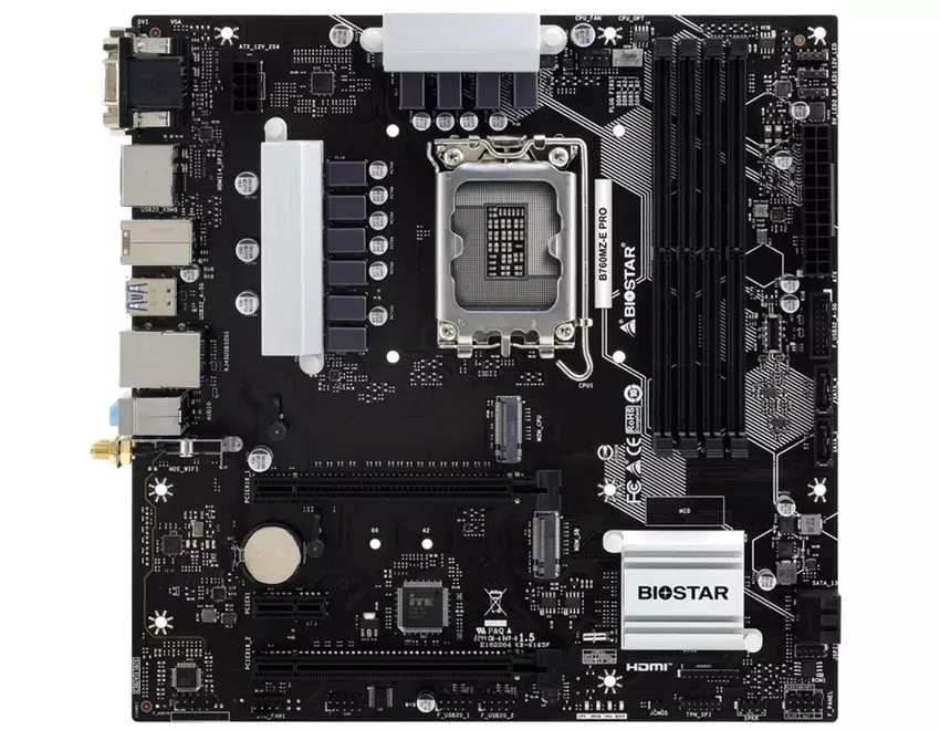 Biostar B760MZ-E Pro - een van de meest betaalbare moederborden op de nieuwe B760 chipset, en toch met ondersteuning voor vooruitstrevend DDR5 RAM. Vier DIMM slots, officieel opgegeven frequentie tot 6000+ MHz en capaciteit tot 128 GB. Maar een BIOS firmware update met maximaal 192 GB wordt waarschijnlijk binnenkort uitgebracht. Compatibel met Intel's 12e en 13e generatie Core-processoren met de codenamen Alder Lake en Raptor Lake respectievelijk. Het voedingssubsysteem is 10-fasen, waarbij acht fasen de processorkernen voeden en nog eens twee fasen de geïntegreerde grafische en geheugencontroller.