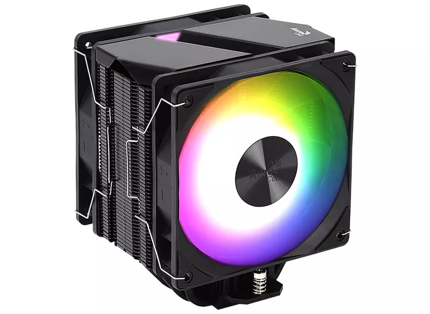 DeAeroCool Rime 4 Dual is een single-tower CPU-koeler met twee 12cm ARGB-backlit fans. Dit verbetert de through-tower luchtstroom en laat de ventilatoren op lage snelheden draaien. De minimale draaisnelheid is 800rpm en als je een matig hete processor hebt, draait de computer volledig geruisloos, zelfs onder belasting. De ventilatoren hebben een hydraulische lagerlevensduur van 60.000 uur. En de ventilatoren hebben AeroFlow-vinnen op het frame om de luchtstroom te helpen concentreren.