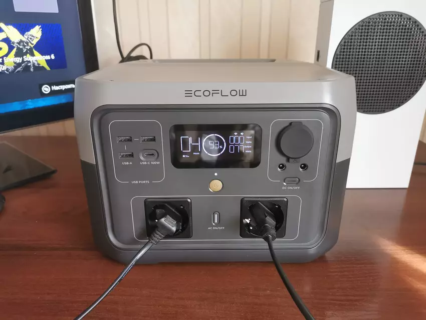 Als u wilt, kunt u een elektrische waterkoker met een vermogen van ongeveer 1,5 kW aansluiten op de EcoFlow River 2 Max. Maar eerst moet u de mobiele app openen en de X-Boost-modus activeren. De waterkoker zal dan werken door de spanning in het stopcontact te verlagen. Maar men moet begrijpen dat het water niet zo snel kookt als wanneer het op een normaal stopcontact is aangesloten. Hetzelfde geldt voor de magnetron en het koffiezetapparaat.