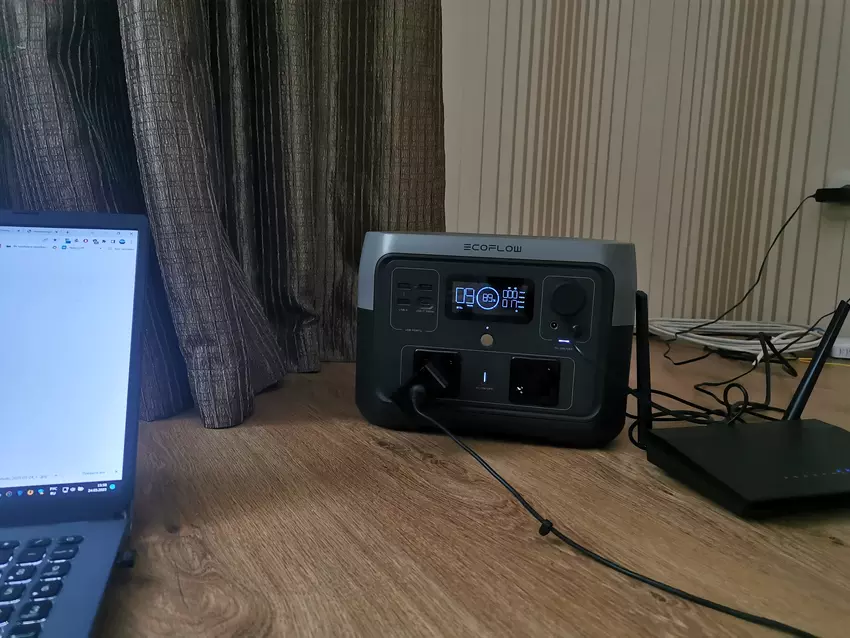 De tests begonnen uiteraard met een laptop en een router. U kunt de DC5521-uitgang gebruiken om een router aan te sluiten. Dit bespaart u een stopcontact en energie, omdat u die niet hoeft te verspillen aan een omvormer. Een werkende ASUS M509-DA laptop met een 32Wh accu, waarvan nog iets meer dan 20Wh over is, verbruikt 15-30W en kan ongeveer 10-13 uur werken.