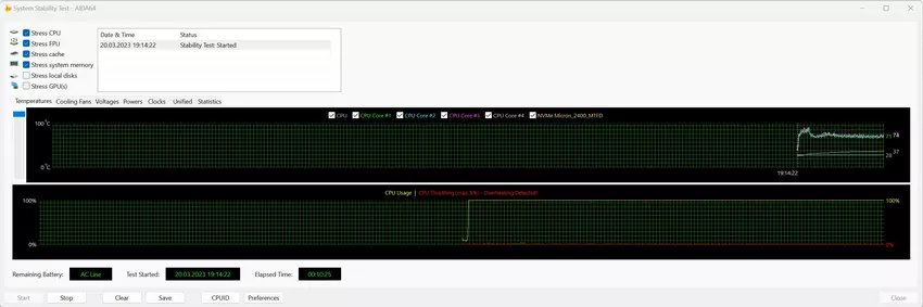 Het ASUS IceCool koelsysteem omvat twee heat pipes en een ventilator. Bij minimale belasting schakelt het over op passieve modus, en werkt de notebook volledig geruisloos. Bij maximale belasting is de ventilator hoorbaar, maar draait hij geruisloos. De behuizing is nauwelijks warm, alleen het gebied boven het toetsenbord wordt warm. Aan het begin van de AIDA64 test warmt het systeem op tot ongeveer 85° en kunnen de prestaties met 5% afnemen. Na aanpassing van het koelsysteem aan de belasting, worden de temperaturen van de componenten op 70-75° gehouden en draait de notebook stabiel.