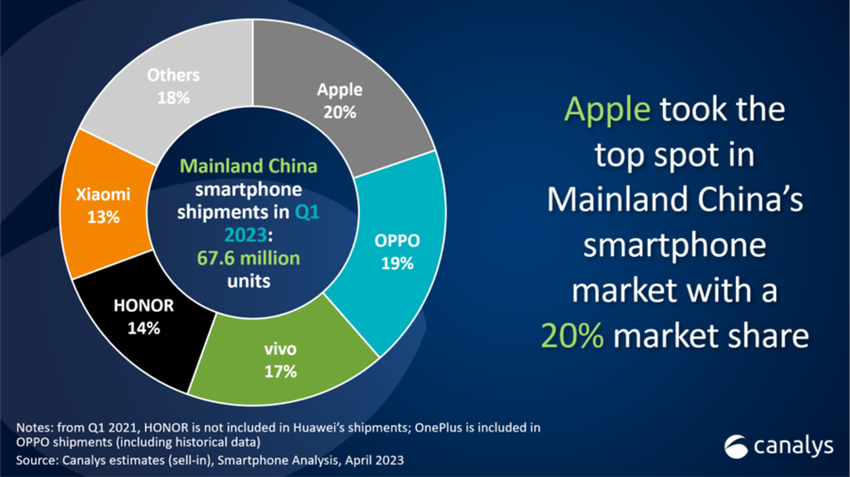 De Chinese smartphonemarkt is, net als de wereldmarkt, in het eerste kwartaal van 2023 gedaald ten opzichte van dezelfde periode vorig jaar. Alle top vijf bedrijven verscheepten minder toestellen dan een jaar geleden. In totaal daalde de markt met 11%, van 75,6 miljoen naar 67,6 miljoen smartphones.