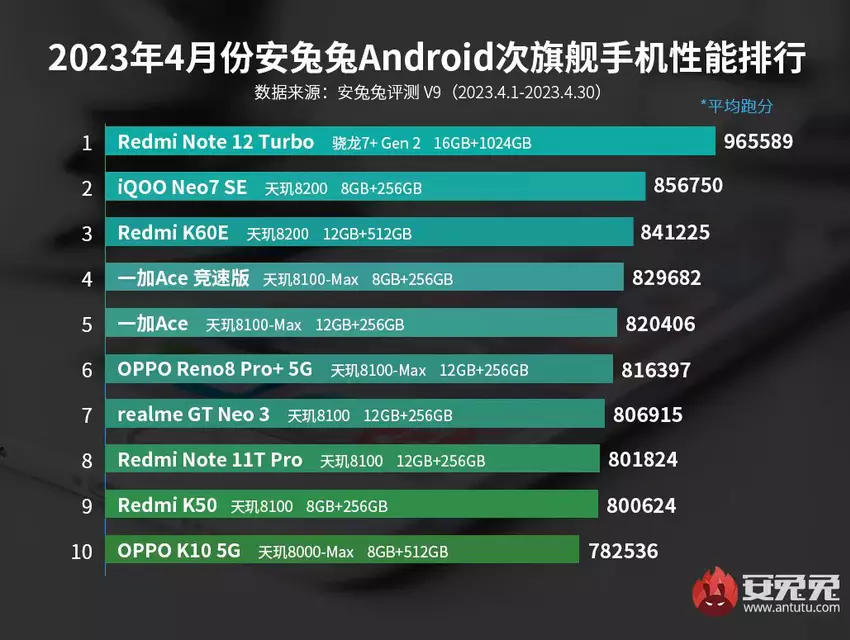 Naast de Redmi Note 12 Turbo haalden ook de iQOO Neo 7 SE en de Redmi K60E met de Dimensity 8200-chip de top 3. De volgende drie smartphones worden aangedreven door de Dimensity 8100-MAX processor: de OnePlus Ace Racing, OnePlus Ace en OPPO reno 8 Pro+ 5G.