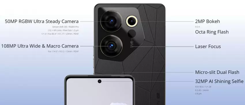 De hoofdcamera heeft ook een 50MP (RGBW, f/1.8, 23mm) hoofdbeeldsensor met optische stabilisatie en een 2MP sensor voor achtergrondonscherpte. De selfiecamera heeft een resolutie van 32 MP (f/2.4).