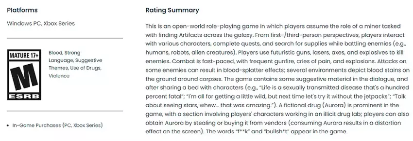 ESRB-experts hebben geweld, bloed, obscene thema's, godslastering, kleine naaktheid en drugsgebruik in Starfield vastgesteld.